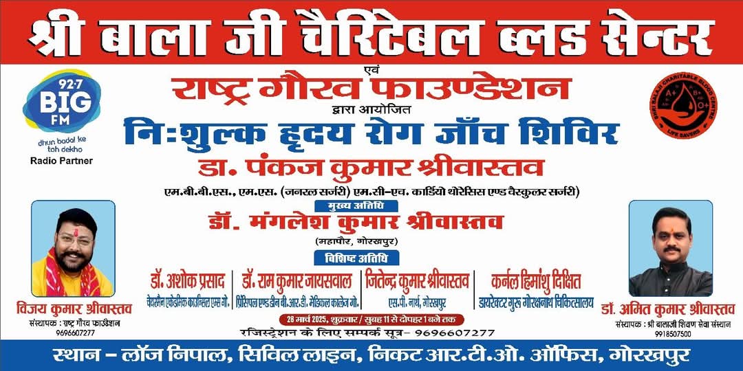 प्राप्त जानकारी के मुताबिक बालाजी शिक्षण सेवा संस्थान, राष्ट्र गौरव फाउंडेशन एवं चरक हॉस्पिटल लखनऊ के संयुक्त तत्वाधान में  नि:शुल्क हृदय रोग जांच शिविर का आयोजन लॉज निपाल-38 नेपाल क्लब गोरखपुर में किया गया. इस नि:शुल्क जांच शिविर में लगभग डेढ़ सौ मरीजों को ईसीजी, ब्लडशुगर एवं बीपी जांच के साथ परामर्श दिया गया. इस…